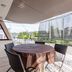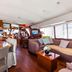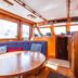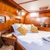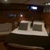 There are 2 cabins, one with a double bed and the other with twin beds. Each cabin has a private shower room and toilet. There is a living room and a dining area with a flat-screen TV and a music speaker system. The boat deck has a furnished terrace area.