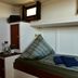 The boat includes 3 bedrooms, 1 bathroom with a shower, a seating area, and a kitchen with a fridge.