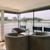 The boat is equipped with 2 bedrooms, 1 bathroom, a flat-screen TV with satellite channels, a dining area, a fully equipped kitchen, and a patio with lake views.