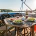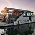 The boat is equipped with 2 bedrooms, 1 bathroom, a flat-screen TV with satellite channels, a dining area, a fully equipped kitchen, and a patio with lake views.