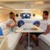 This air-conditioned boat comes with 2 bedrooms, a flat-screen TV, a dining area, and a kitchen with a fridge and a stovetop.