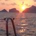 The three-cabin boat has 2 bathrooms and a kitchenette.