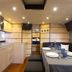 There is a seating area, a dining area and a kitchenette complete with a fridge, an oven and a stovetop.