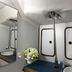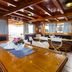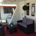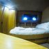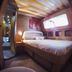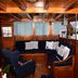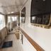 Common areas on board include a sundeck, an indoor seating room with a flat-screen TV, and a kitchenette equipped with a microwave and a kettle.