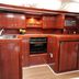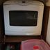 There is a seating area and a kitchen complete with a fridge, an oven and a toaster.
