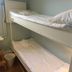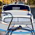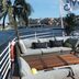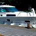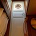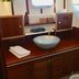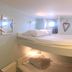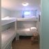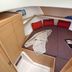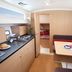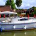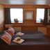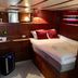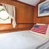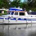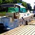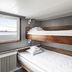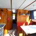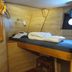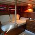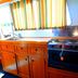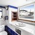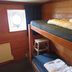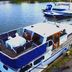 The boat has 2 cabins, a kitchen with a fridge and a stovetop, and 2 bathrooms with a shower.