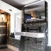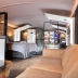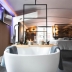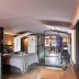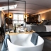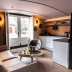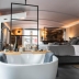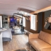 The room has a large seating corner set up around the TV. The kitchenette comes with microwave, refrigerator and a tea/coffee maker. Other amenities include king-size bedding and a rain shower.