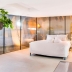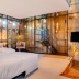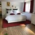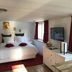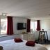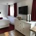 The room has a large seating corner set up around the TV. The kitchenette comes with microwave, refrigerator and a tea/coffee maker. Other amenities include king-size bedding and a rain shower.
