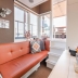 The room has a large seating corner set up around the TV. The kitchenette comes with microwave, refrigerator and a tea/coffee maker. Other amenities include king-size bedding and a rain shower.