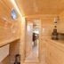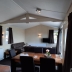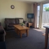 The room has a large seating corner set up around the TV. The kitchenette comes with microwave, refrigerator and a tea/coffee maker. Other amenities include king-size bedding and a rain shower.
