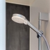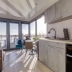 The room has a large seating corner set up around the TV. The kitchenette comes with microwave, refrigerator and a tea/coffee maker. Other amenities include king-size bedding and a rain shower.