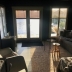 The room has a large seating corner set up around the TV. The kitchenette comes with microwave, refrigerator and a tea/coffee maker. Other amenities include king-size bedding and a rain shower.